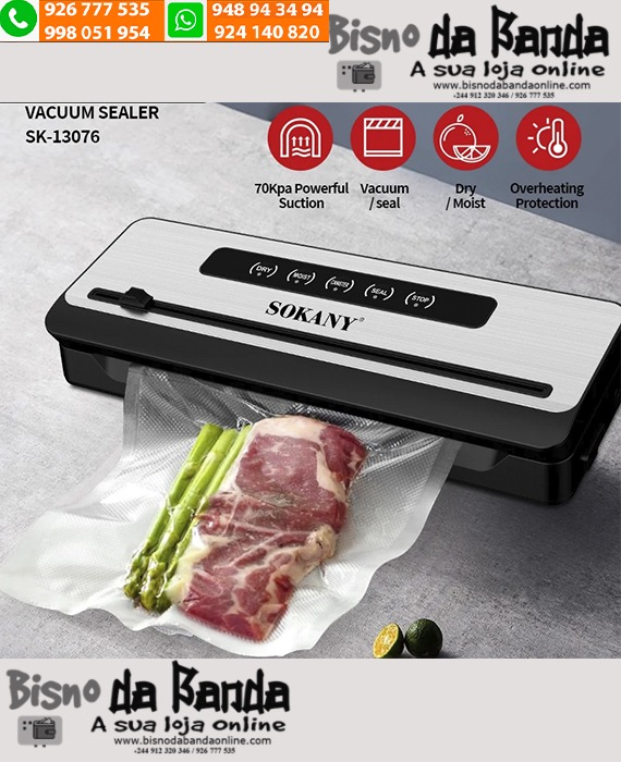 Selador a vácuo portátil de 200W. Combina aço inoxidável e plástico para maior durabilidade. Com sucção de -70kPa e comprimento de vedação de 32 cm (largura de 3 mm),  suporta os modos seco e húmido para preservação precisa do frescor. O design compacto garante fácil armazenamento, ideal para uso doméstico com vedação única.